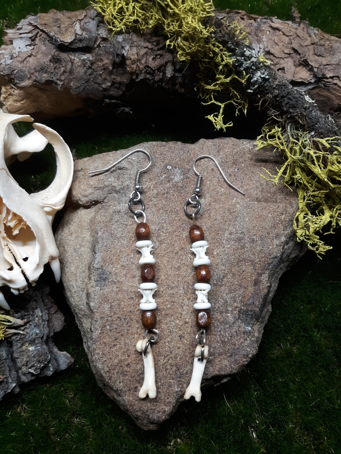 These earrings are made with two raccoon phalanges, four small water snake vertebrae, six bone disc beads, and six acacia wood beads on silver beading wire and silver shepherd hooks.