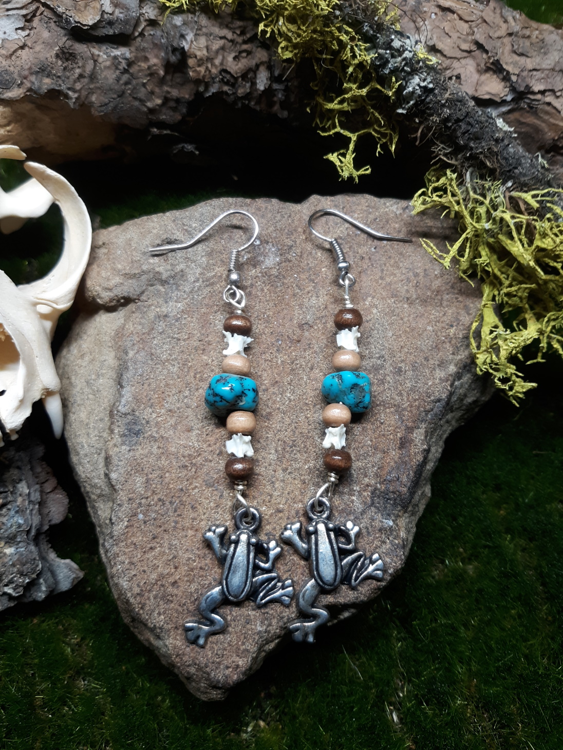 These earrings are made with two turquoise stones, four light acacia wood beads, four dark acacia wood beads, and four small snake vertebrae on silver wire, with silver shepherd hooks and silver toad charms.